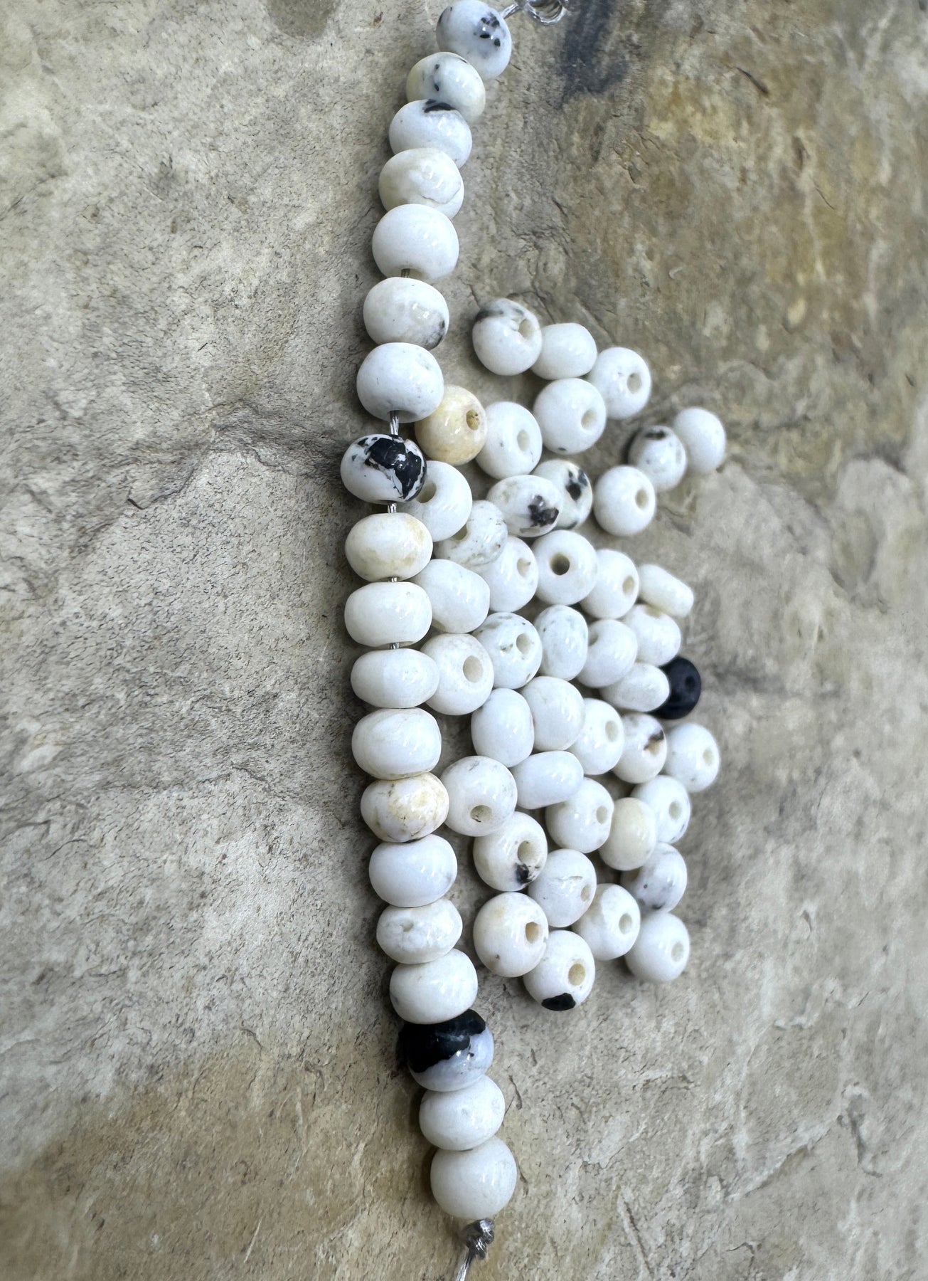 White Buffalo stone (NV) ... a lot of sellers call it White Buffalo Turquoise, but it is NOT turquoise in makeup though it was discovered in a turquoise mine in Tonapah, Nevada. The white stone is surrounded by black and brown chert which creates beautiful patterns and matrixing. Beware that howlite is is often represented as White Buffalo, but it is more of a cream white with grey erratic veining and not black. Howlite is very common and White Buffalo comes from only one mine in Nevada.