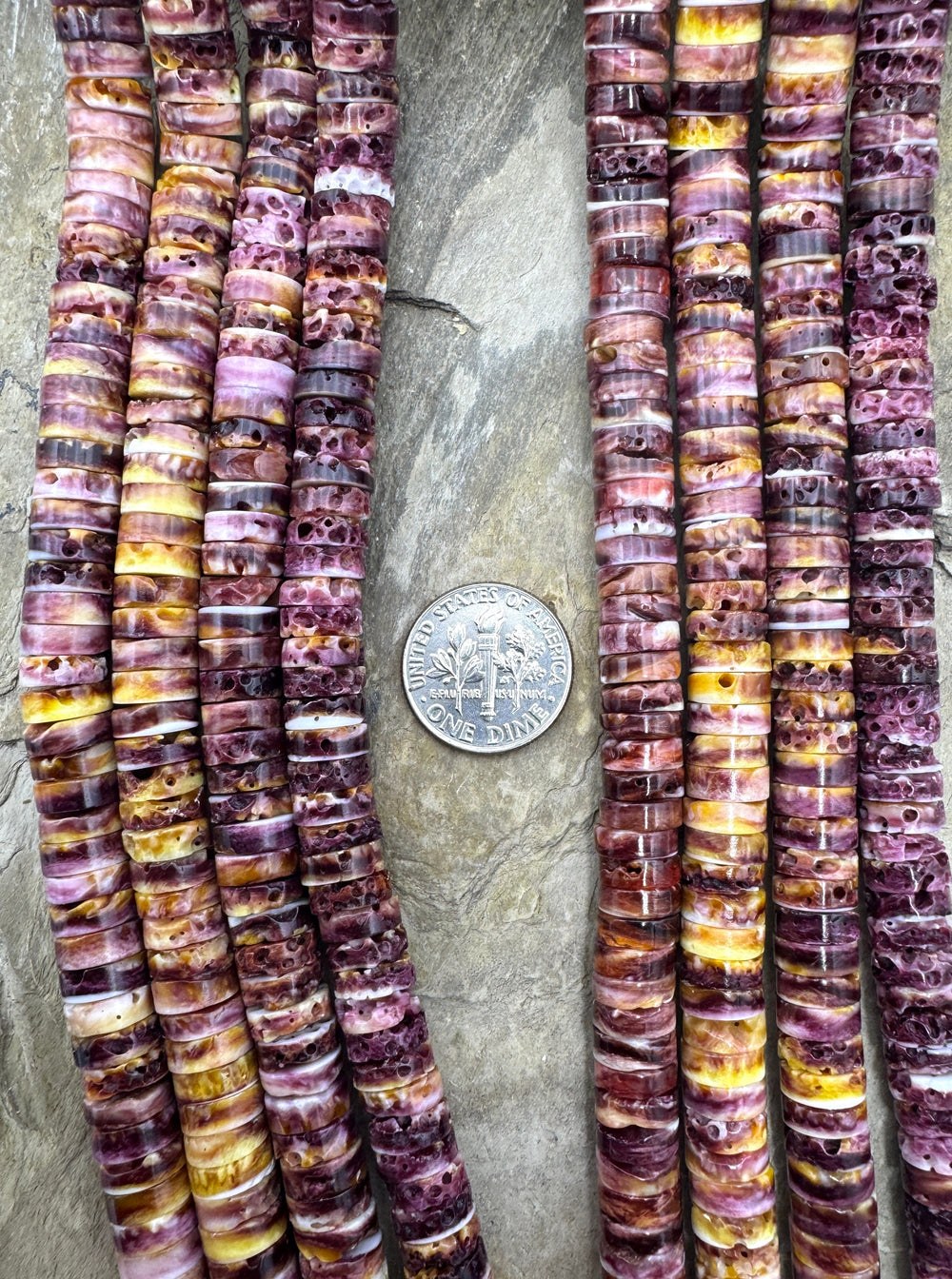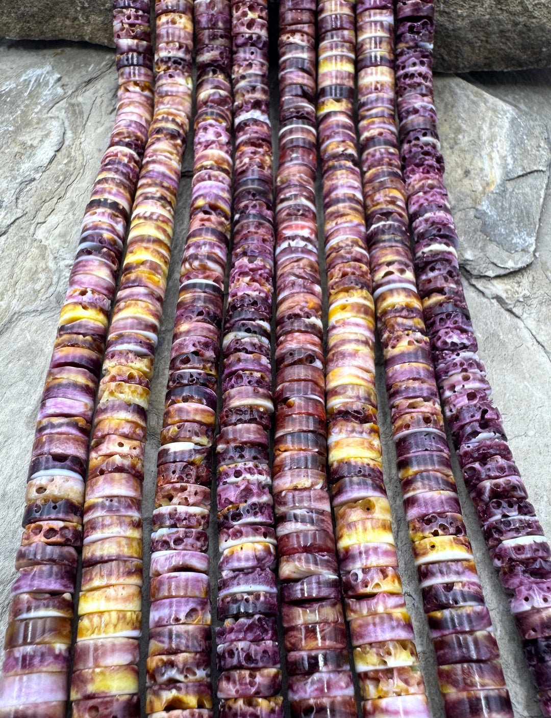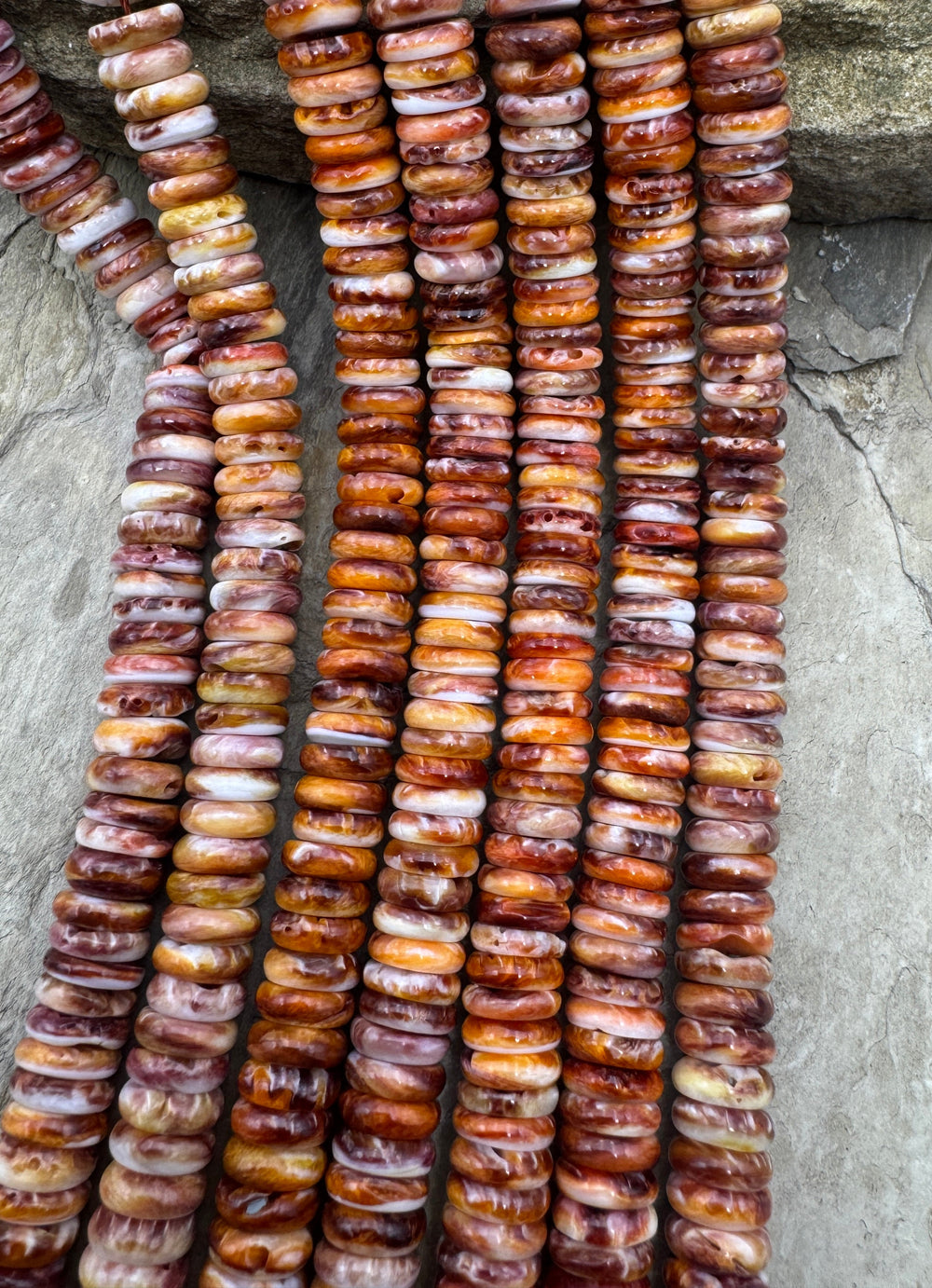 Spiny Oyster shell and Lions Paw Shell comes from the Sea of Cortez in Mexico and has always been a favorite of the Native American Indian jewelry artists and can be found in various shades of orange, red and purple. We recently discovered a source for Lions Paw shell beads which is very similar to Spiny Oyster, except that the interior of the shell has less white and these shells can be orange on one side with purple on the inside thus making are really gorgeous two-color bead! The Lions Paw is found from the Carolina's to the Gulf of Mexico and down the Atlantic side of South America. There are limited suppliers for the Spiny Oyster beads and cabochons and we always try to hand pick these strands to eliminate as much white on the beads as possible. The Lions Paw beads are just coming onto the market and are fairly hard to find . . . they sell out fast!