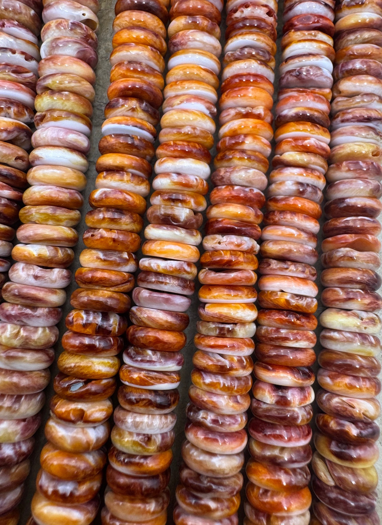 Spiny Oyster shell comes from the Sea of Cortez in Mexico and has always been a favorite of the Native American Indian jewelry artists and can be found in various shades of orange, red and purple. There are limited suppliers for the Spiny Oyster beads and cabochons and we always try to hand pick these strands to eliminate as much white on the beads as possible.